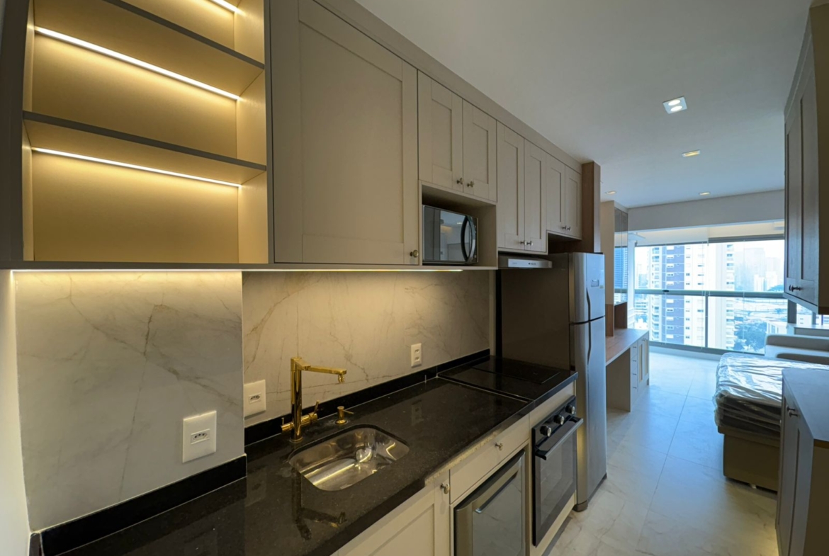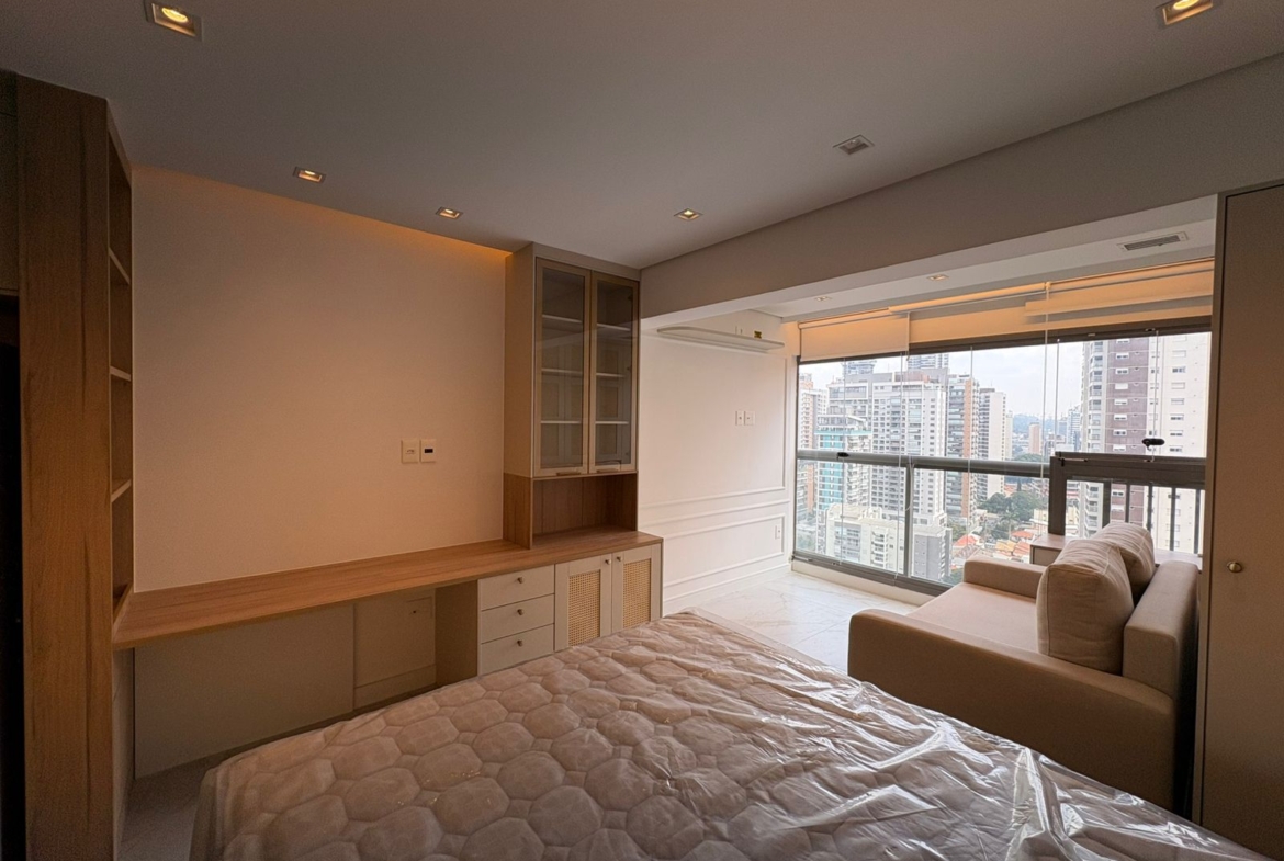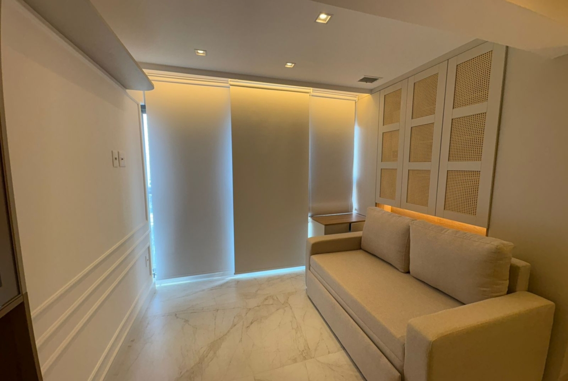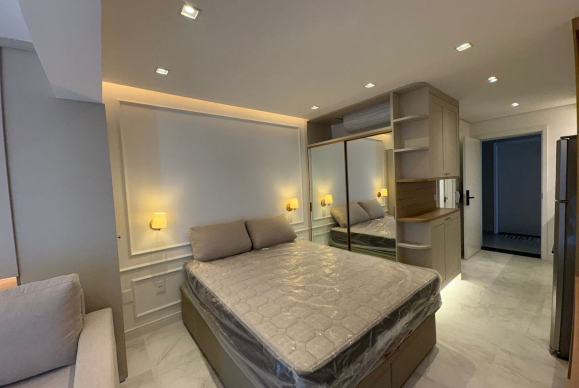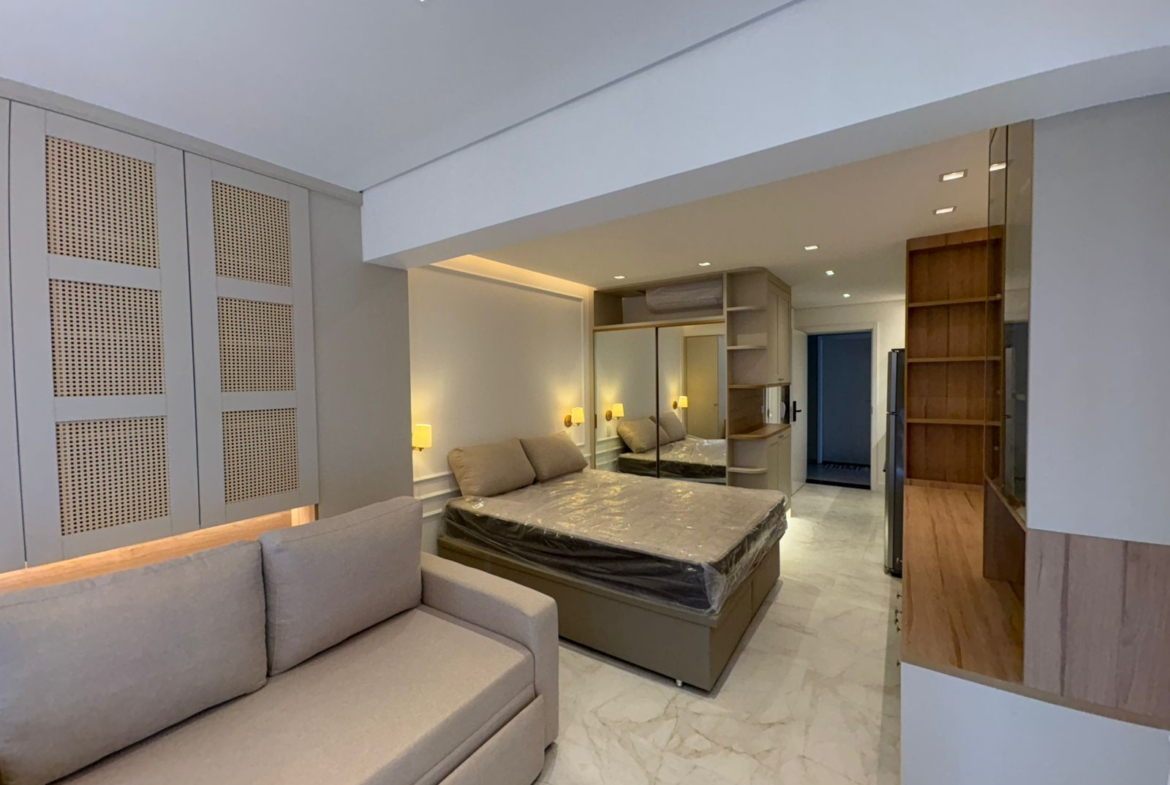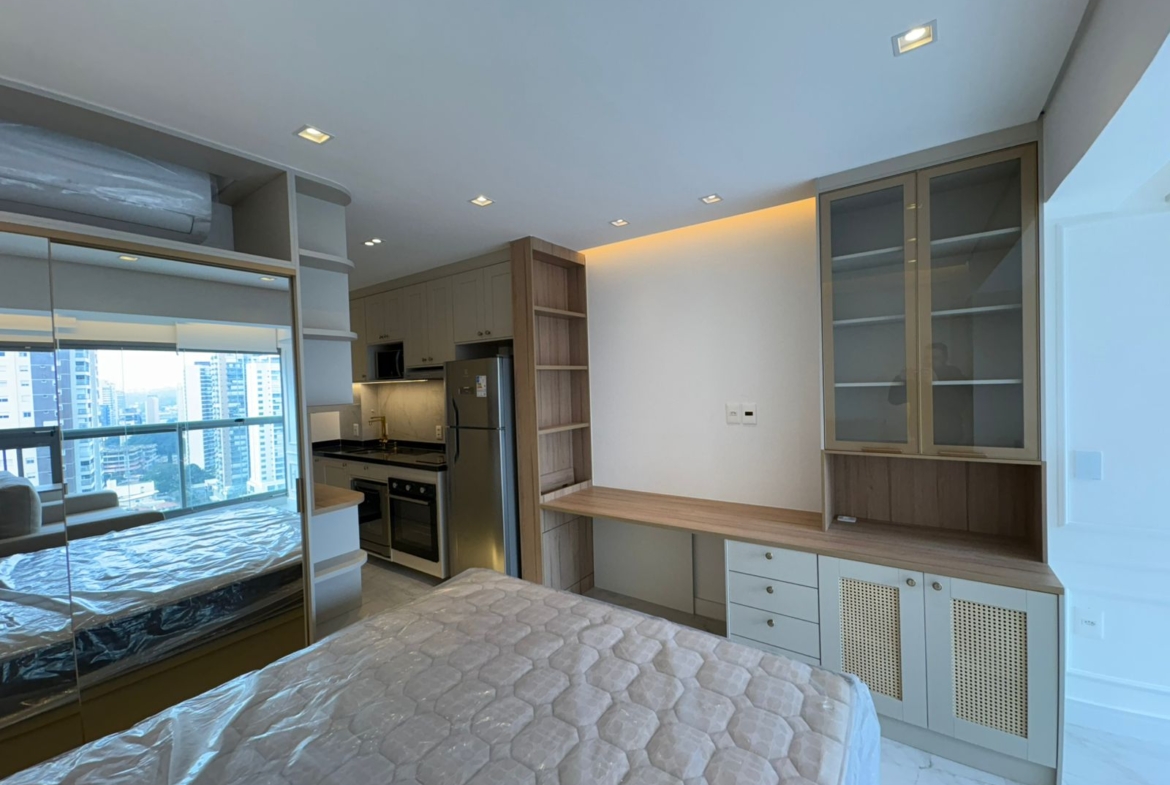 Studio muito bem planejado, com área separada para TV. Cada espaço foi aproveitado trazendo conforto, praticidade e elegância.