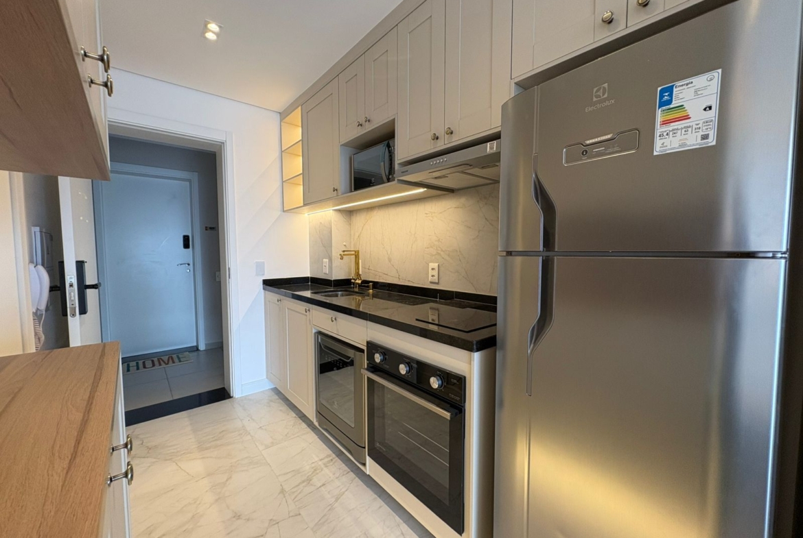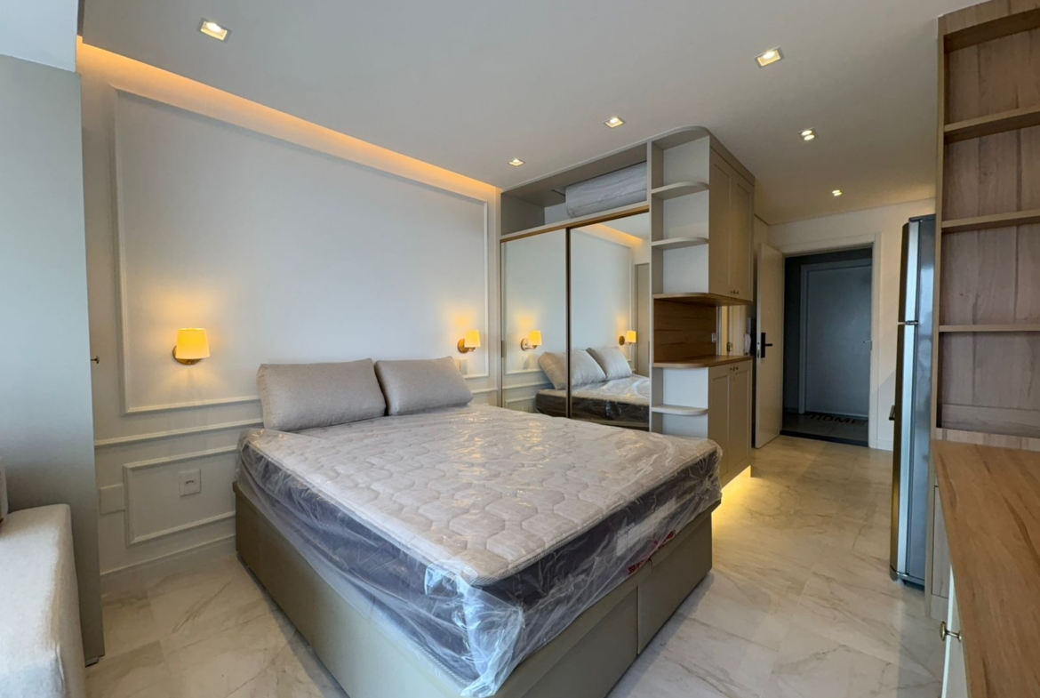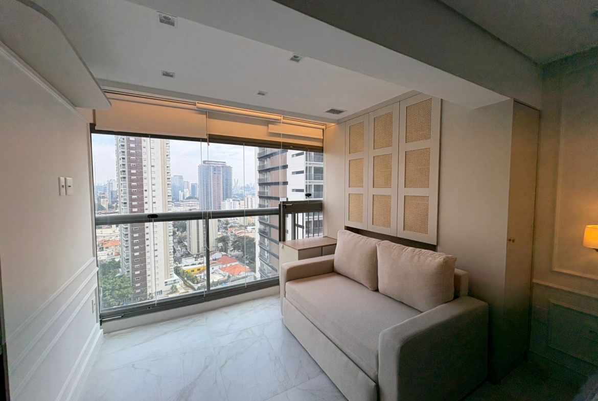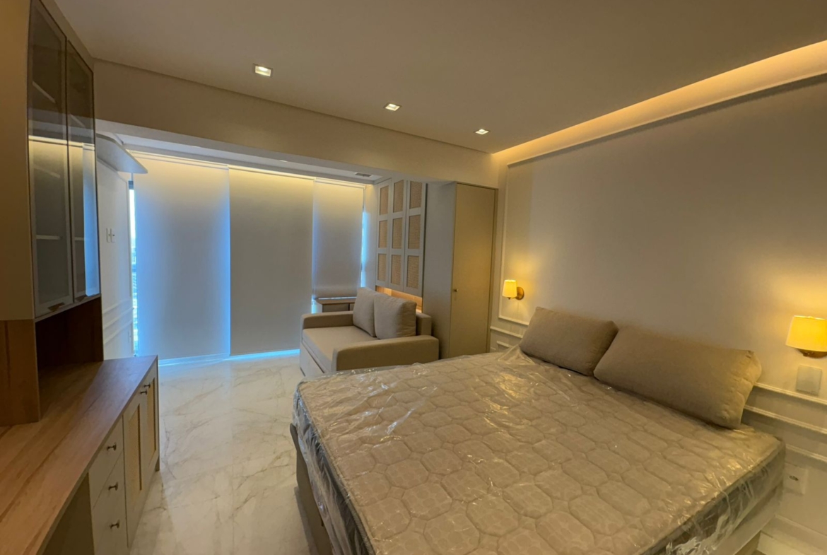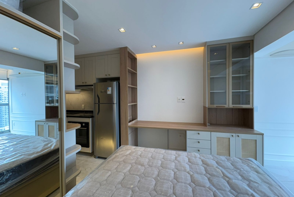 Studio muito bem planejado, com área separada para TV. Cada espaço foi aproveitado trazendo conforto, praticidade e elegância.